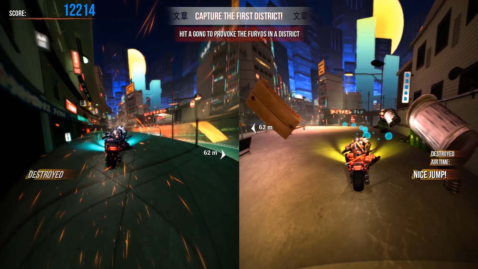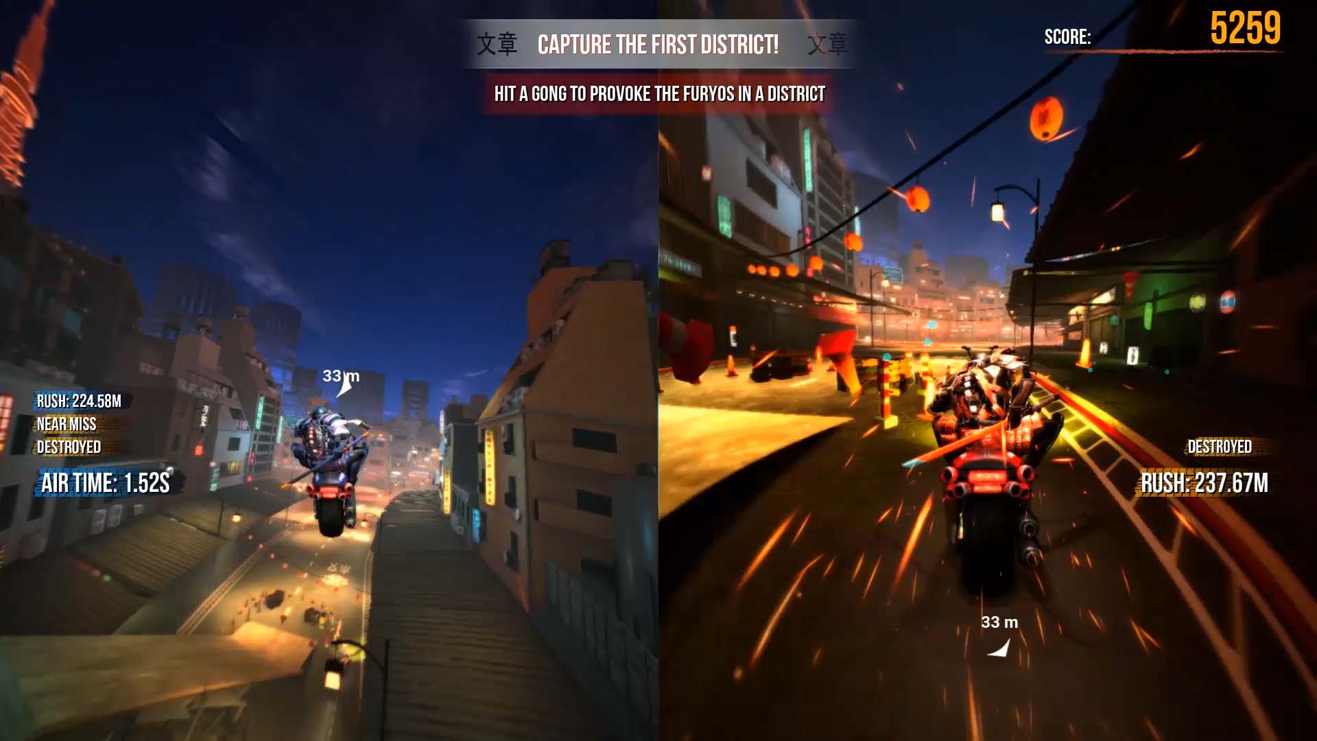 In this cooperative motorized beat'em up, the two players play on the same device, using a split screen. Riding their bike through the city, they will have to conquer each district by defeating the punks, before facing their boss. It’s a frantic third person action game, that requires dexterity and timing to win.