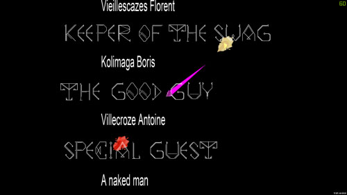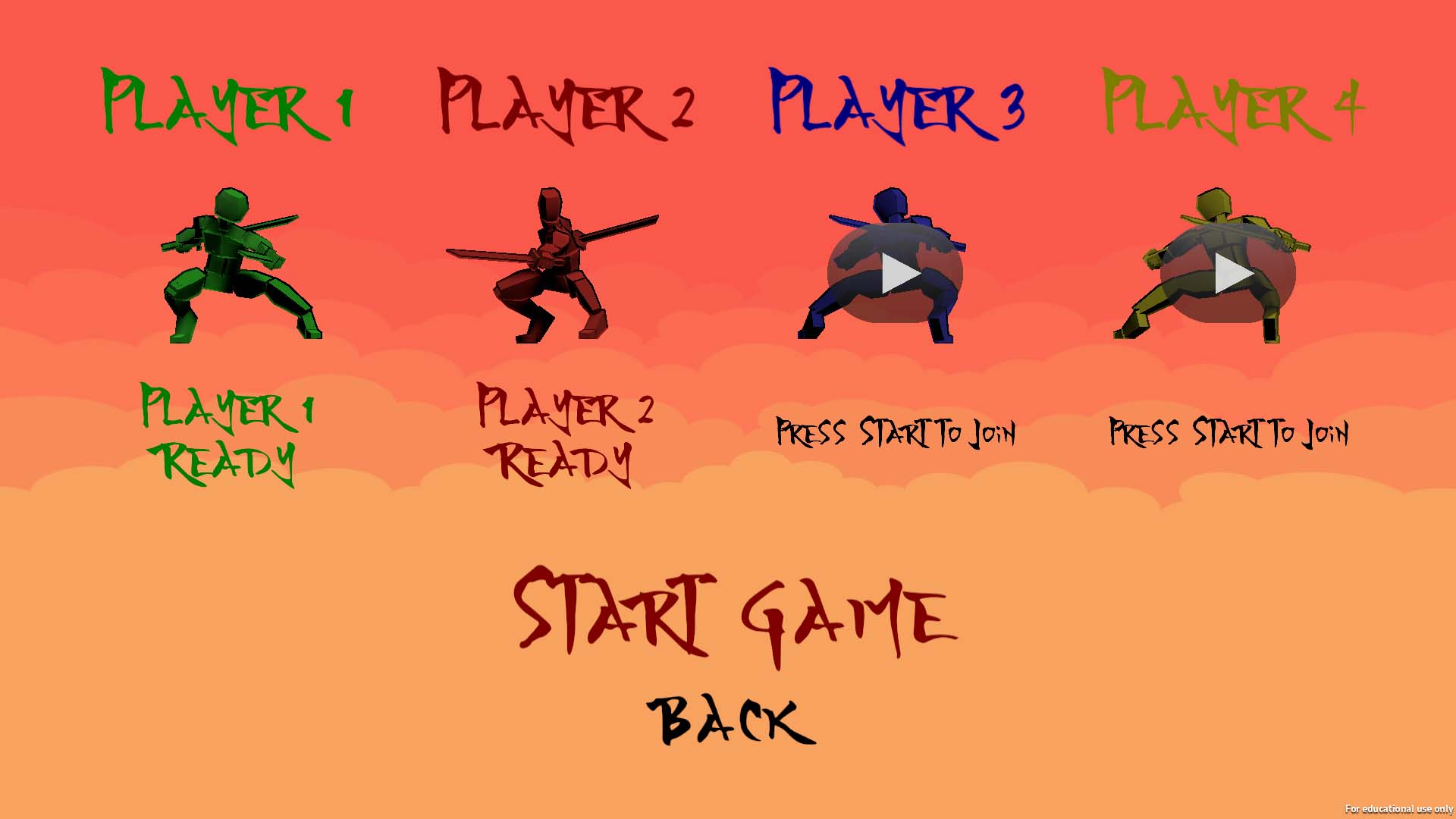 During those two days, I mainly worked on the game and level design, but I also worked a lot on the UI and the menus (directly in Unity). For instance, I scripted the buttons (espcially their feedbacks) and implemented the "Character Selection" menu (the one with the four ninjas). Also, I designed the screen that appears at the end of a round and showing the number of kills by players.