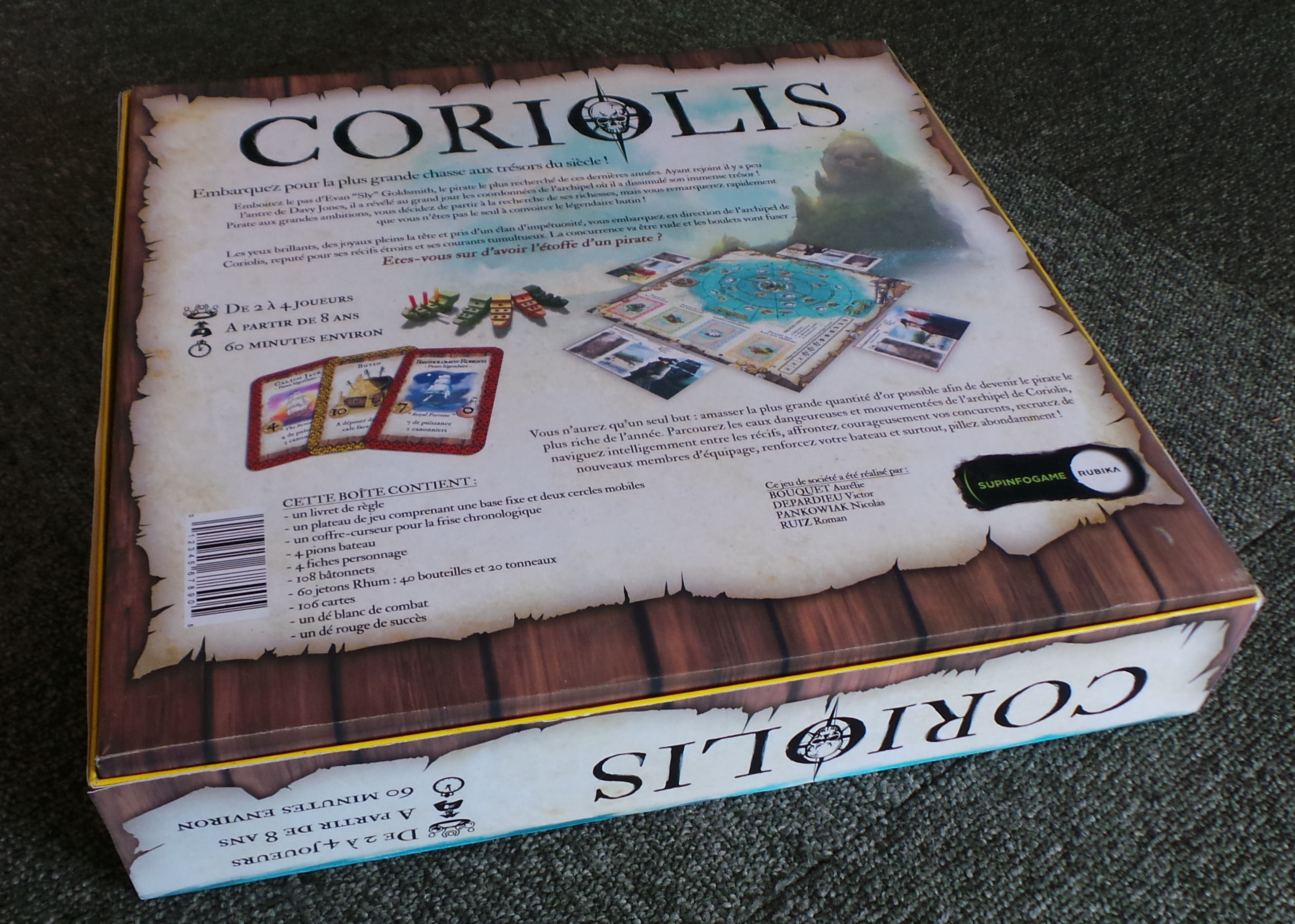Coriolis is a strategy game in which 2, 3 or 4 players will have to navigate in the extraordinary Coriolis archipelago, avoid deadly reefs, pillage islands, plunder merchant ships or fight other pirates. They will have to upgrade their ship with more cannons or reinforcements, or recruit new members in order to collect as much gold as possible and be the most powerful pirate before the archipelago disappears in the depth of the sea with the legendary loot of Evan 'Sly' Goldsmith.